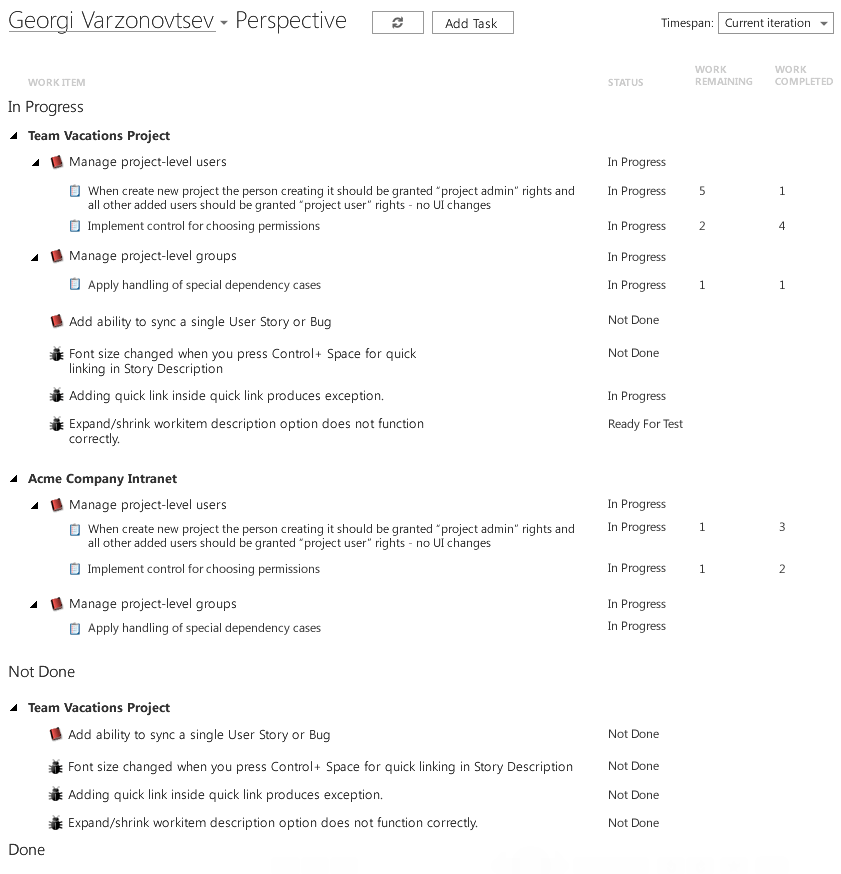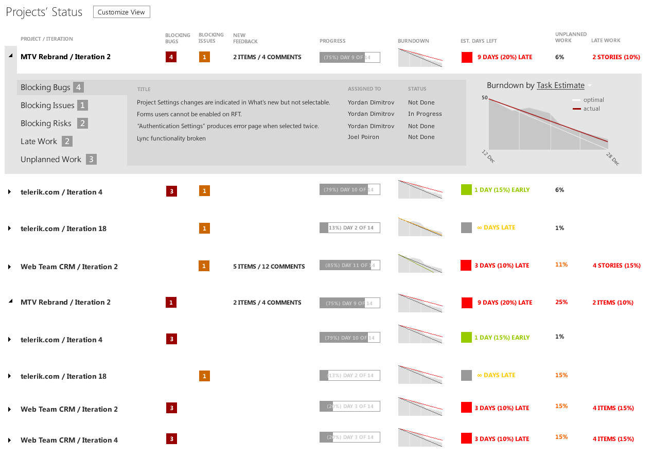 One the following screenshot you can see a dashboard listing all projects you have selected and the progress of the current iteration for each project.