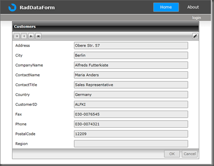 <Grid x:Name="LayoutRoot"> <telerik:RadDomainDataSource x:Name="customersDataSource" AutoLoad="True" QueryName="GetCustomers" > <telerik:RadDomainDataSource.DomainContext> <svc:NorthWindDomainContext /> </telerik:RadDomainDataSource.DomainContext> </telerik:RadDomainDataSource> <StackPanel x:Name="ContentStackPanel" Style="{StaticResource ContentStackPanelStyle}"> <telerik:RadDataForm Header="Customers" AutoGeneratingField="RadDataForm_AutoGeneratingField" CommandButtonsVisibility="Cancel,Commit,Edit,Navigation" EditEnded="RadDataForm_EditEnded" ItemsSource="{Binding DataView, ElementName=customersDataSource}" /> </StackPanel> </Grid>