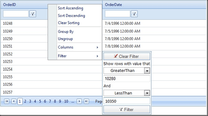 As of Q1 2010 RadGrid will be equipped with a new filtering menu – a powerful and flexible feature the interest in which was sparked by RadGrid’s MVC counterpart offered by Telerik. It will be a sub-part of RadGrid's header context menu and will allow for filtering the grid's data on two conditions related with a logical AND operator: