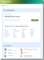 where one can choose to browse the resources for our ASP.NET AJAX controls in general, a particular RadControl or explore all support resources for a given product line/specific control based on their type (see the 'Or, just check...' panel in the screen shot).