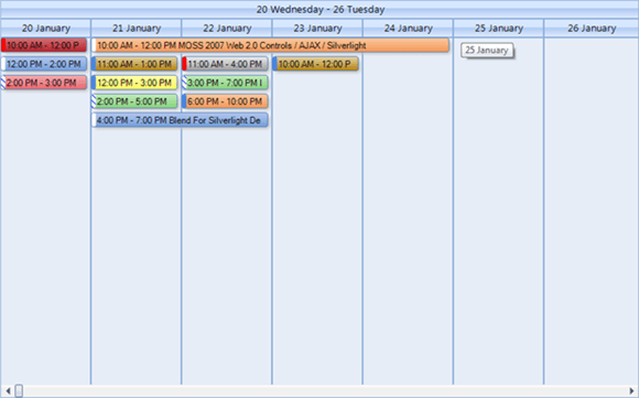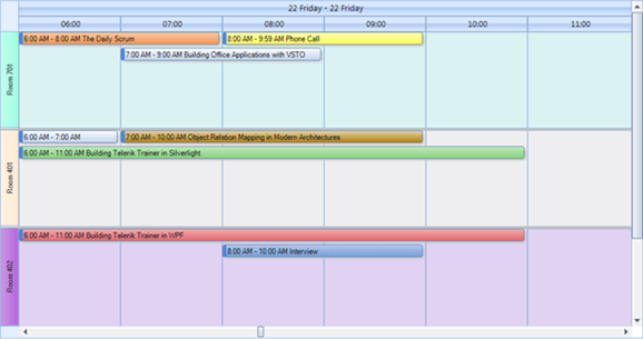 RadScheduler for WinForms will include a brand new Timeline View , designed to display continuous schedule for one or multiple resources. Time-slot duration, time-slot cells count, visible resources count and view’s duration will be fully customizable. For example you can set the time-slot duration to any value from 15 minutes to 1 year and restrict your scheduler view from 01/01/2009 to 01/01/2011.
