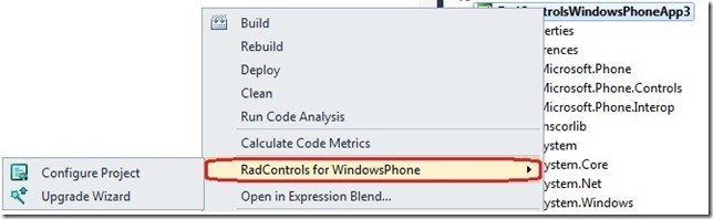 If you have an existing Windows Phone project that doesn’t use the Visual Studio Extensions then you can easily convert it to a Telerik one using a similar wizard. It is launched either through the Telerik menu, or through the context menu of the project.