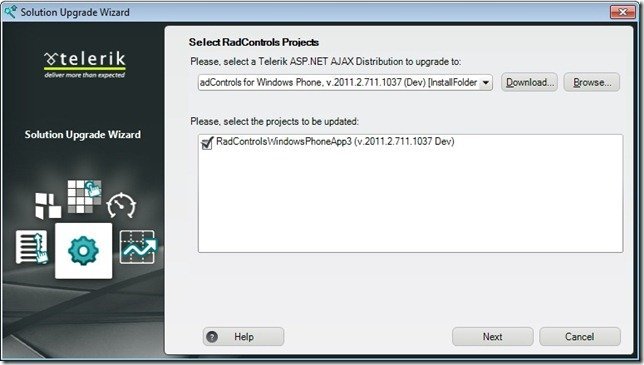 You can choose which projects should be updated to the new version of RadControls. The Upgrade Wizard will replace the Telerik assembly references if the selected distribution is different than the one the project currently uses. You can browse to a manually downloaded distribution (it is not automatically discoverable) or download the latest available.