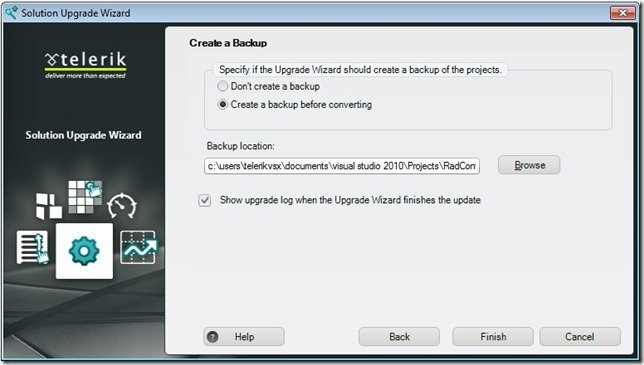 As a next step you can choose whether you want a backup of your project. The Upgrade Wizard can create a backup copy of the project to easier deal with any breaking changes that might have been introduced to RadControls. If backup operation is chosen, you could select the folder where the project will be backup up.