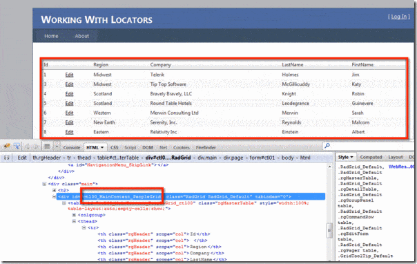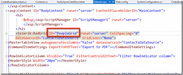 In this example, however, the developer has appended “PeopleGrid” to the grid’s ID as shown in the .aspx page’s markup below, resulting in the more specific ID “ct100_MainContent_PeopleGrid” as shown above.