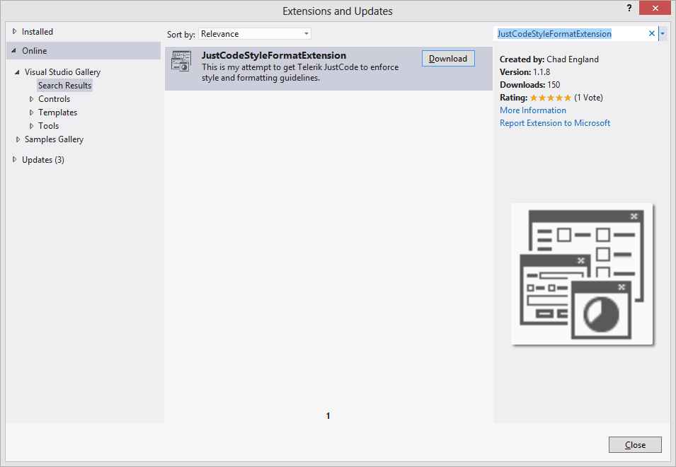 If you would like to try it out, simply open Extensions and Updates in Visual Studio, click on the Online dropdown, search for JustCodeStyleFormatExtension, and then click Download.