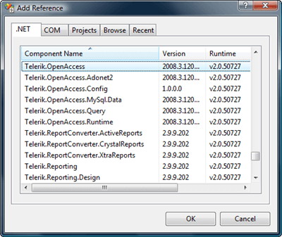 Since you’re using OpenAccess classes with the WCF service, you need to add a reference to the Telerik.OpenAccess namespace to the project. Otherwise, the project will not compile. Right-click on the project’s References folder and select Add Reference…, select the .NET tab and choose Telerik.OpenAccess.