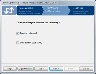 This will launch the Telerik.OpenAccess Enable Project Wizard. Click Next to continue to the second page of the wizard. Here you’ll select the Persistent classes? checkbox and click Next.