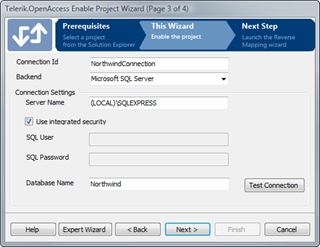 On the next screen you’ll configure the connection to the database. In this case you’ll be connecting to the Northwind database, which I assume is hosted in SQL Server Express. Add NorthwindConnection to the Connection Id field, ensure Microsoft SQL Server is selected from the Backend dropdown, and enter the name of your server in the Server Name field. If you use integrated security to authenticate your SQL Server connections, go ahead and leave the Use integrated security checkbox selected. Otherwise, provide your username and password details. Finally, type in the name of the database, Northwind, and click Test Connection to ensure you’ve set the connection up right. Click Next.