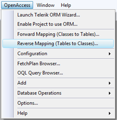 Now that the connection to the database has been set up and the project has been enabled, it’s time to launch the reverse mapping wizard. With your project selected, select OpenAccess | Reverse Mapping (Tables to Classes)… from the Visual Studio menu.