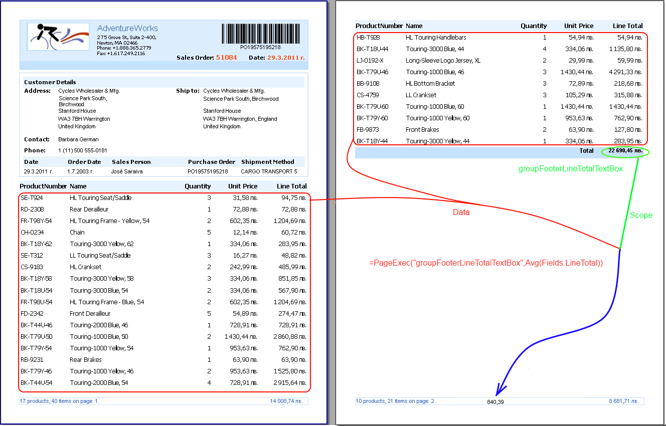 If the report item is located in Group Header, Group Footer sections, and Table groups the PageExec will work over the entire raw data that is bound to the group members. For example if certain group member is rendered on two pages the PageExec will work on the group member’s data no matter if it’s rendered on two or more pages. This is done to make sure that the data will be correctly calculated over the groups and no partial group member’s data is used in the aggregates.