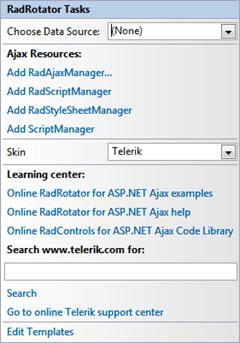 One great feature that I often overlook in the RadRotator and many other Telerik controls is the design experience they offer in Visual Studio. I’m a code guy so I rarely enter the Visual Studio Designer, but occasionally I’ll have a need to get something together really fast, at which time the design-time experience of the RadControls is critical to my success. Through the use of smart tags, developers rarely have to go to the Properties window or fuss with any code/markup in order to configure the important features of the RadControls. For RadRotator specifically, you can set the Skin and DataSource properties right from the context menu.