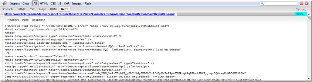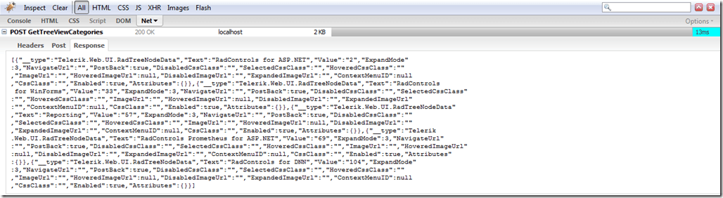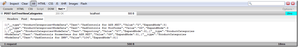 As you can see only the relevant properties are transmitted back from the server. However there is still one thing bothering me - that "__type":"ProductCategories+NodeData" string does not seem to be relevant in this scenario. Fortunately the fix is quite simple - change the return type of the WebService method from RadTreeNodeData[] to IEnumerable. Here is the output after this change (total size is 310 bytes) Not bad! If you don't plan to use server-side postback events (such as NodeDrop and NodeClick) you can improve the total performance even more by setting the PersistLoadOnDemandNodes property to false. By default this property is set to true which means that RadTreeView logs (in JSON format) all nodes created on demand so they are later available after postback (required for server-side events). However this operation may become time consuming in case there are lots of load on demand nodes. If you don't need postback events just set that property to false to enable logging and persistence. Even if you need postback events you can "fake" them using RadAjaxManager. You can check the attached example for a sample implementation.