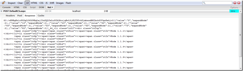 Server-side callback relies on the ASP.NET 2.0 built-in callbacks. It is significantly faster than the server-side postback mode because it renders only the nodes loaded on demand as well as some event validation data. Here is a typical output rendered by a server-side callback (total size is 1631 bytes):