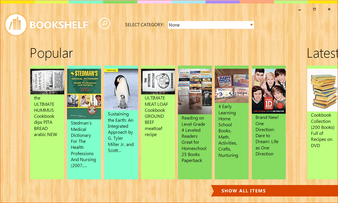 The application downloads all the book details' data utilizing an Ebay web service and then displays all titles as tiles sorted in different categories with the help of RadPanorama. All screens have touch scrolling functionality that comes out of the box with this Windows 8 inspired control.