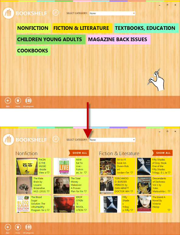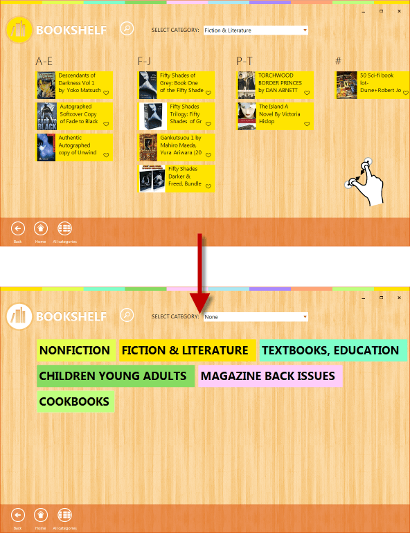 Touch gestures like zoom in and zoom out allows for navigating between the screens. For example, you can start with the “Particular Category” screen and then intuitively zoom out by pinching in with your thumb and pointer fingers to go to the “All Categories - Overview” screen which will reveal a list of all categories easily created by using the RadListView component. After exploring all the categories, perform a zoom-in gesture on the “All Categories - Overview” screen to quickly navigate to the “All Categories - Books” screen: We just wanted to show you how easily we implemented this behavior utilizing the built-in multi-touch support feature in RadListView. Below follows the code:void radListView1_ZoomGesture(object sender, ZoomGestureEventArgs e) { if (CurrentScreen == PageID.AllCategoriesZoomedOut && e.ZoomFactor > 1) { CurrentScreen = PageID.AllCategories; } }