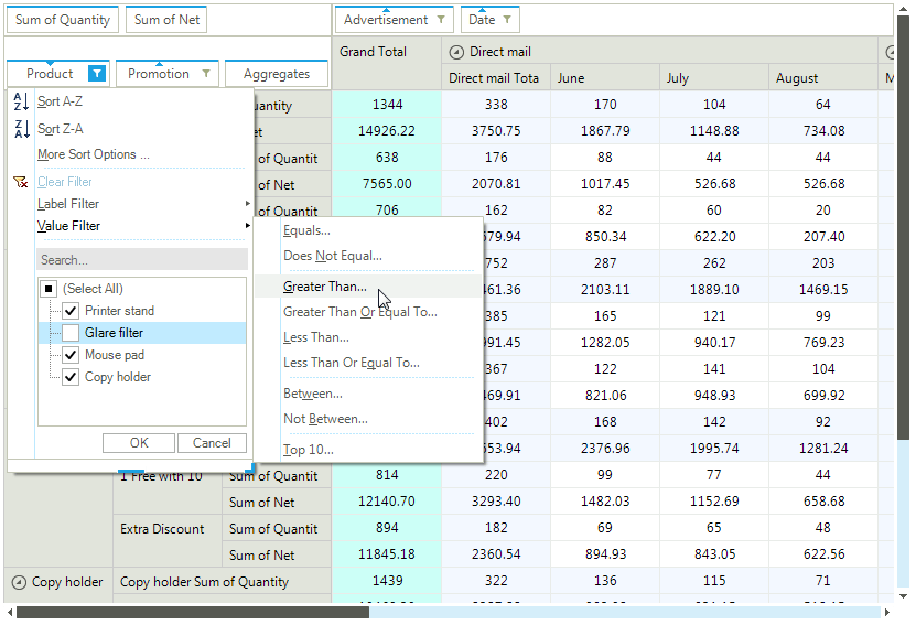 The group filtering capabilities available to the end-user by context menus and dialogs resemble pretty much of those available in MS Excel, so if your customers are well acquainted with Excel, there’s nothing to worry about – they will be able to dive into our filtering with ease: PivotGrid Filtering