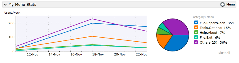 From this Feature Usage graph, we can see the most selected item from our main menu is the one that is used to display the Open Report dialog – 35% of the overall main menu activity is users clicking on this specific menu item. Only 16% of activity on the main menu revolves around accessing the Options dialog. With this information it is easy to conclude that our time is better spent by implementing the usability enhancements on the Open Report dialog.