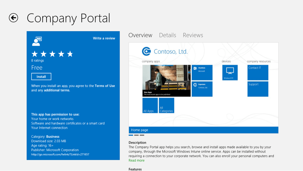 Last October Microsoft released an update to Windows Intune that let you deploy Windows 8 apps as well. Developers can install the fully immersive “Company Portal” app from the Windows Store and then install app made available by their company onto their devices. However in order to install apps from Windows Intune portal, devices must be enabled for sideloading.