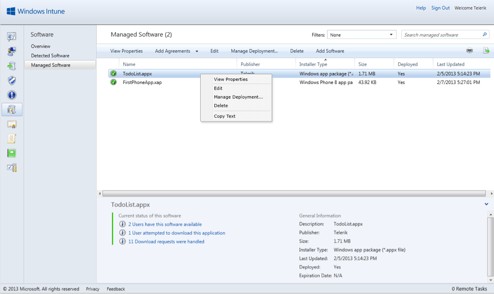 To enable Windows 8 devices for sideloading, it is required to obtain sideloading product activation keys. You can purchase these keys through the Microsoft Volume Licensing program. After obtaining the keys, they must be added to the portal using the Intune administrative console. This process is outside the scope of this post, so I used an alternative way to deploy apps to Windows Intune without processing the licenses.  This approach is only for example purposes and not meant for real scenarios.