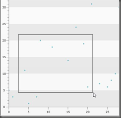 First let’s start with the rectangle selector that the user draws with its mouse. I have added a canvas on top of the Radchart to hold the rectangle. We need to listen to MouseLeftButtonDown, MouseMove and MouseLeftButtonUp events to control the rectangle position and size. The tricky part is how to convert the size of the rectangle to a data range. Well that’s easy, because the Axis exposes methods that allow us to convert physical units to data units.