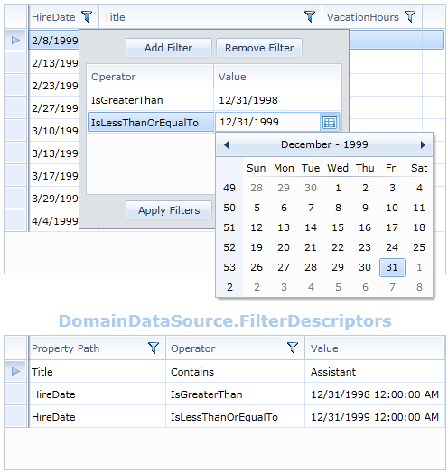 this.employeesDataSource.FilterDescriptors.Add(new System.Windows.Data.FilterDescriptor("HireDate", System.Windows.Data.FilterOperator.IsLessThanOrEqualTo, new DateTime(1999, 12, 31)));