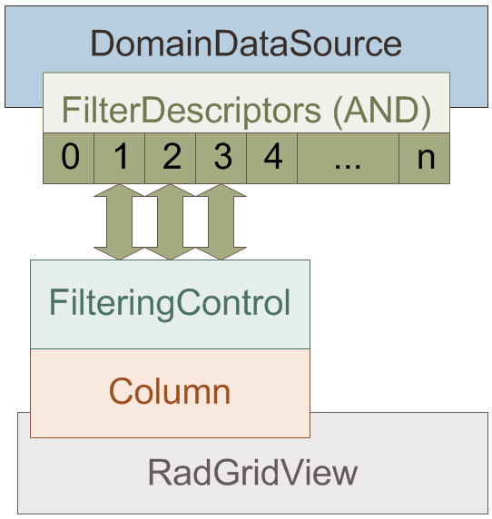I have created a simple custom filtering control that contains a RadGridView and several buttons. This control is aware of the DomainDataSource instance, since it is operating on its FilterDescriptors collection. In fact, the RadGridView that is inside it is bound to this collection. In order to display filters that are relevant for the current column only, I have applied a filter to the grid. This filter is a Telerik.Windows.Data.FilterDescriptor and is used to filter the little grid inside the custom control. It should not be confused with the DomainDataSource.FilterDescriptors collection that RadGridView is actually bound to. These are the RIA filters.