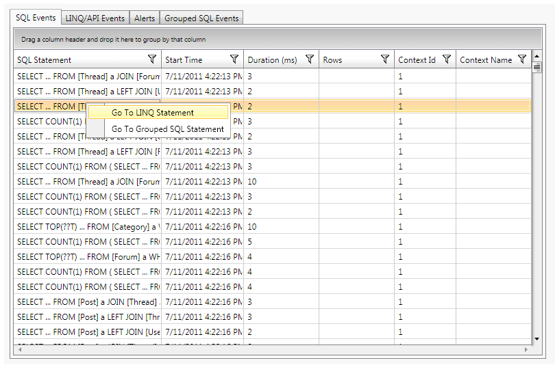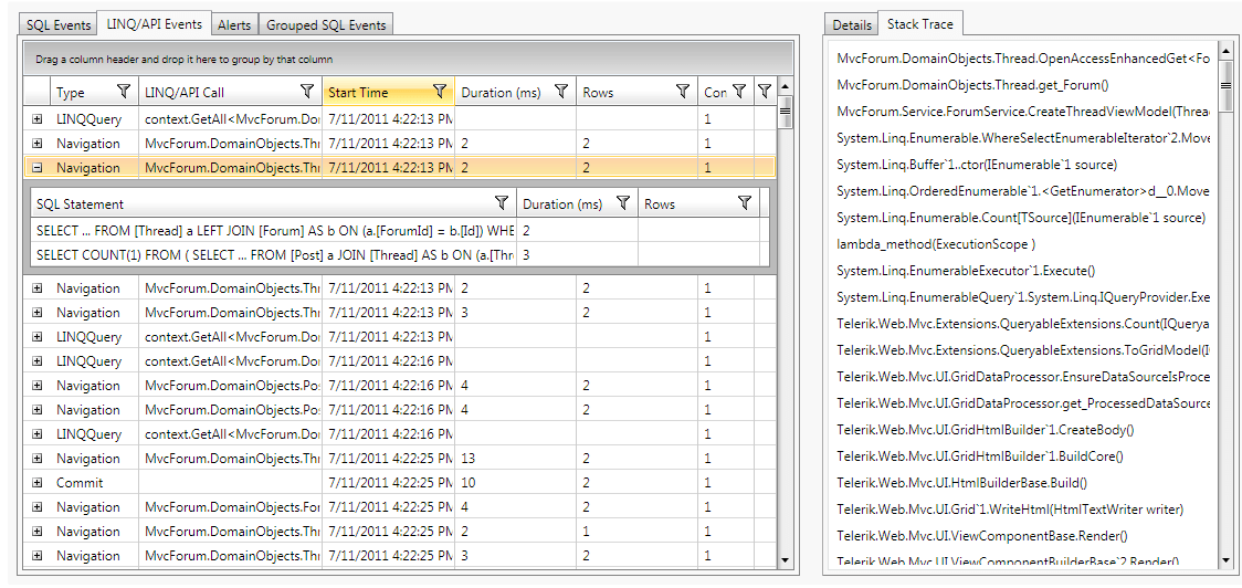 When looking at the SQL, LINQ, or API events, developers are also presented with a full stack trace making it very easy to discover the call site.