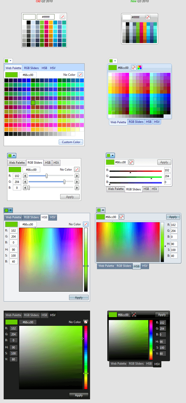 Apart from the polishing of the overall look & feel, we “rounded” corners for all palettes and added shadows for the popup palettes. Another major difference is the order of colors in the Default preset palette. I know that the old and the new Default palettes look strikingly different, but I assure you that both preset palettes consist of the same colors, the only difference is the way we have ordered the colors. For those of you, who prefer the old order, you can easily get the control to display the old Default palette by combining the Web216 and Grayscale palettes.