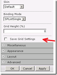 As of the Q3 release TelerikSPRadGridWebPart will give you the opportunity to persist any grid settings for subsequent visits to the page. In order to take advantage of this feature just put a check-mark to the settings persistence check-box in the Web Part’s tool part GridSettings menu: