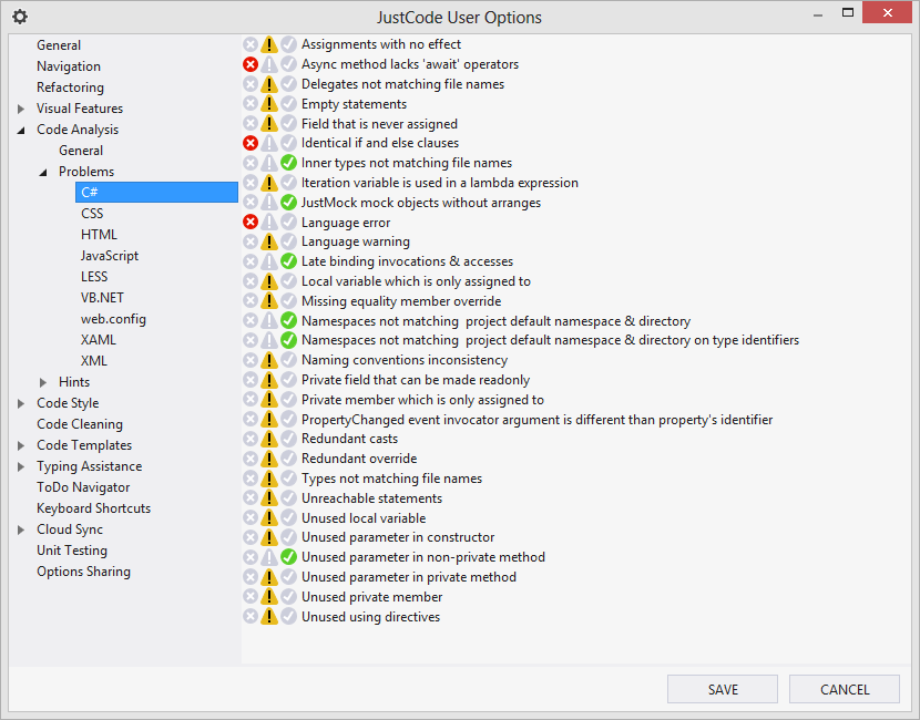 Warnings and errors that you can configure to be either warnings, errors, or none is confusing. We now call them code problems, and you get to decide if it’s an error, warning, or neither. Do you name types and files differently and you want to keep this convention? Open Options from the JustCode menu and expand the tree as follows: Code Analysis, Problems, C#. Click the green check next to “Types not matching file names” and you’re good to go.
