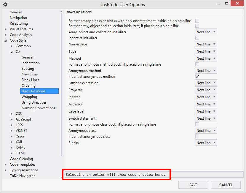 JustCode has had preview panels for some Code Style options, but finding them requires clicking the label for the option. It wasn’t obvious that you could do this, so we now notify you when previews are available.