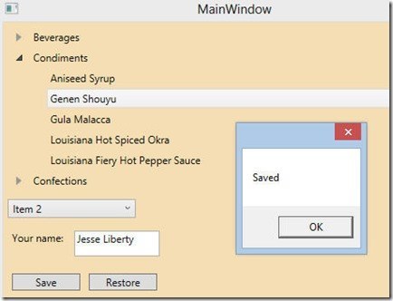 Finally, we add two buttons: Save and Restore. Their event handlers manage storage to Isolated Storage and restoration, respectively, The Save button event handler creates an instance of the IsolatedStorageProvider class and then calls SaveToStorage on that instance. It then informs the user of success.