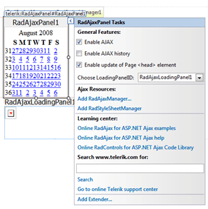 But besides the obvious Ajax functionality of the RadAjaxPanel, several other features have been included to help the RadAjaxPanel rise even further above its cousin the UpdatePanel. First, as all other Telerik controls, the RadAjaxPanel offers a much richer design-time experience. Many of the important properties, which will be discussed shortly, can be included by simply checking them off on the context menu. Enable or disable Ajax functionality, hook it up to a RadAjaxLoadingPanel, or click a link for instant online help. Design-time development is much easier than with the UpdatePanel. No more switching to Source View to add a property or hunting for it in the Properties window.