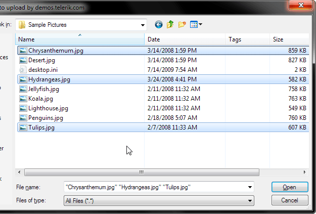 First the most important new feature, seen above – Multiple file selection! RadAsyncUpload now allows users to select multiple files at once in the File Selection dialog which is very handy in scenarios where uploading a large number of files is needed. You can see this in action on our live demos.