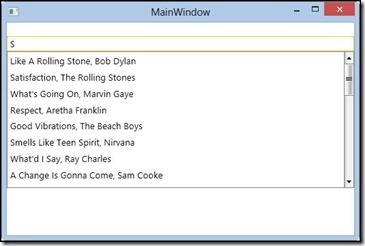 No code-behind is needed; the XAML is sufficient to make all this work. Just start the application and your MainWindow will come up with a TextBox visible. Type a letter into the TextBox and watch the suggestions unroll below the letter. As you type, the suggestions are narrowed.
