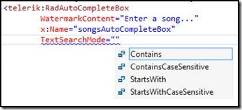 WatermarkContent="Enter a song..." x:Name="songsAutoCompleteBox" TextSearchMode="Contains" AutoCompleteMode="Suggest" TextSearchPath="Title" SelectionMode="Single" ItemsSource="{Binding SongsList}" DropDownItemTemplate="{StaticResource SongsSearchAutoComplete}" VerticalAlignment="Top" Margin="0 20 0 0" Height="22" BorderBrush="#FF25A0DA" BorderThickness="1" />