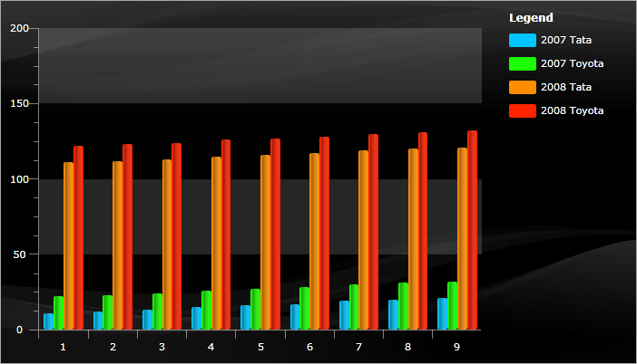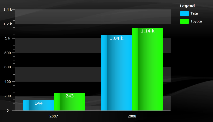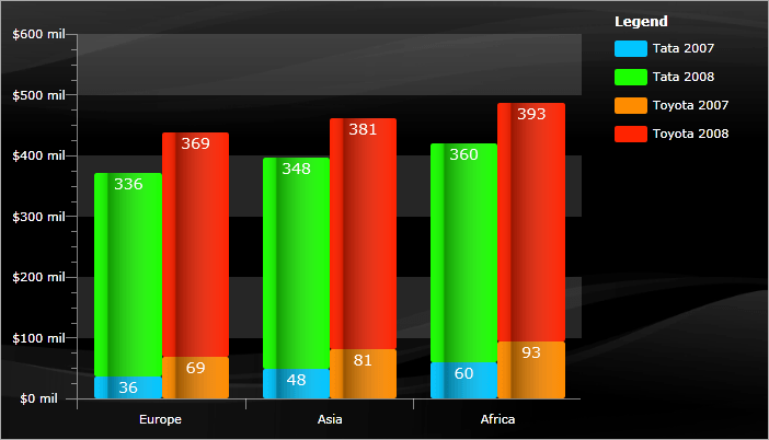 In the above graph you can see the data broken down by Regions, Companies and Years. For example we will now be able to tell how Toyota is competing to Tata in Europe on a Year-By-Year basis AND for the whole period at the same time. This is possible thanks to the specifics of our Stacked Bar series and the ability to assign a different StackGroup for each company. This is a pretty complex data query by all standards and it is now possible to do in RadChart out-of-the-box with less then 8 lines of code!