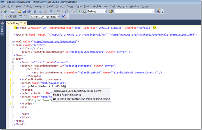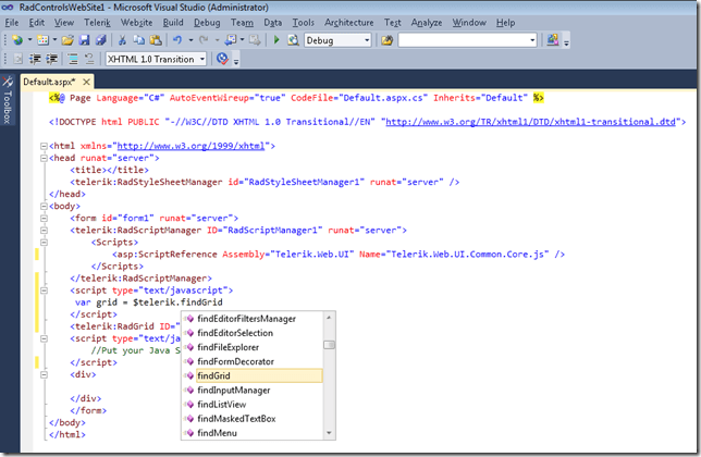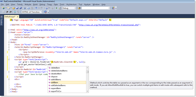 What about the JavaScript IntelliSense? Well, I believe this will be the shiny gem that each of us who use RadControls for ASP.NET AJAX and write javascript code will cherish. No need to burry yourself in the client API documentation, no more annoying js errors being generated from non-existing properties/methods or mistyped code slices! Simply register Telerik.Web.UI.Common.Core.js using RadScriptManager/MS ScriptManager under VS 2010 or MS ScriptManager under VS 2008 and enjoy the out-of-the-box JavaScript IntelliSense in the markup of your pages.
