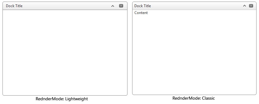 <div style="height: 300px; width: 400px; margin-bottom: 20px; transform: none; backface-visibility: visible; position: absolute; left: 758px; top: 48px;" class="RadDock RadDock_Default rdRoundedCorner" id="Div1" tabindex="0"> <div class="rdTitleWrapper"> <div class="rdTitleBar rdDraggable" id="Div2" style="cursor: move;"> <h6 class="rdTitle">Dock MetroTouchBlack</h6> <ul class="rdCommands"> <li class="rdListItem"><button class="rdUnpin" title="Pin" type="button" style="">Pin</button></li> <li class="rdListItem"><button class="rdCollapse" title="Collapse" type="button">Collapse</button></li> <li class="rdListItem"><button class="rdCustom" title="Custom" type="button">Custom</button></li> <li class="rdListItem"><button class="rdClose" title="Close" type="button">Close</button></li> <li class="rdListItem"><button class="" title="Custom" type="button">Custom</button></li> </ul> </div> </div> <div class="rdContentWrapper"> <div class="rdContent" id="Div3" style="height: 0px; overflow: auto;"> Content </div> </div> </div>Both modes will look the same, actually:
