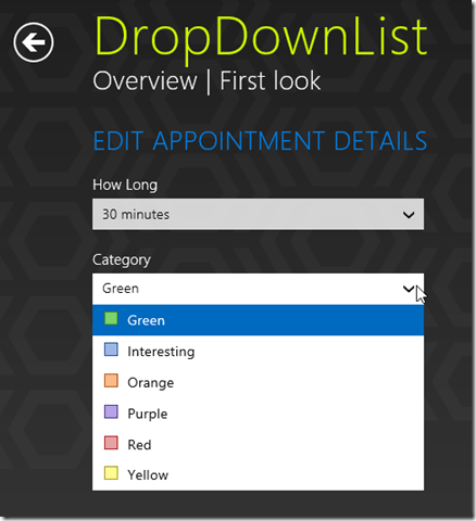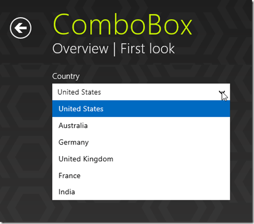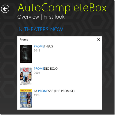 Similarly, our ComboBox for Metro is much more powerful than what comes out of the Win 8 box, offering Google-like suggestions and auto-complete as you type. Besides selecting an item from the ComboBox’s drop down list, you can enter custom text in the textbox area. ComboBox can be populated either by a local array or remote data like movies database or list of stocks coming from an online service.