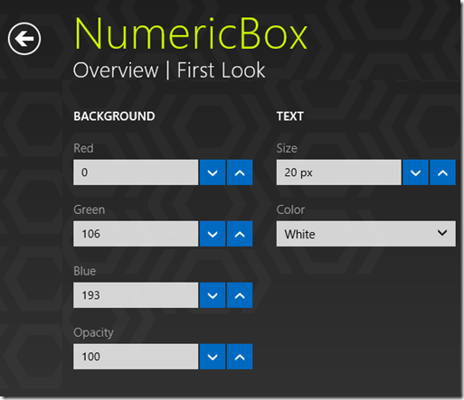 NumericBox provides precise control over changing numeric values in your application. It provides increment and decrement buttons that allow the user to change the value with a predefined step.