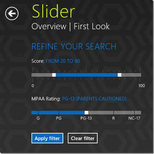 Our Slider is much more powerful than the Slider control included in the Windows 8 toolbox, offering two thumbs to more precisely adjust a range of values.