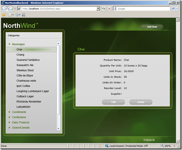 Yesterday I wrote about how to databind RadTreeView for Silverlight to ADO.NET Data Service and use Load on Demand. The simple application from yesterday was upgraded to a small back-end application for the Northwind database, that allows editing and deleting products. This time I decided to give it to one of our designers and our new Silverlight front end developer and they implemented this slick design: