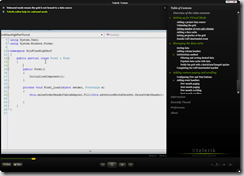 Recently there was a question posted on the Telerik forums asking if there were plans to include some Telerik Trainer videos for the RadControls for WinForms. The timing of this question was great since there was already a video being produced on this very topic. If you haven't experienced the Telerik Trainer, you are missing out. It presents video content on a given topic with the ability to jump to any part of that video via the Table of Contents. Additionally, when there is code being presented as part of the video the Telerik Trainer allows you open the code for that portion. So the Telerik Trainer is a fast and easy way to get up to speed on a given topic.