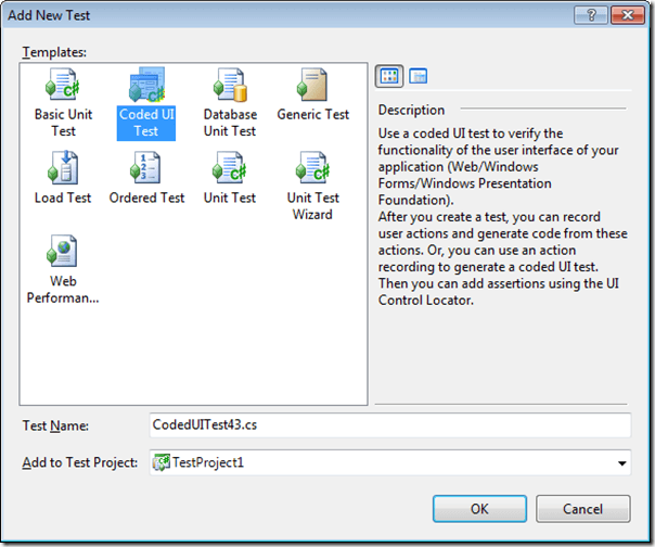 1. Let's choose "Coded UI Test" from Visual Studio's Test menu. Press OK