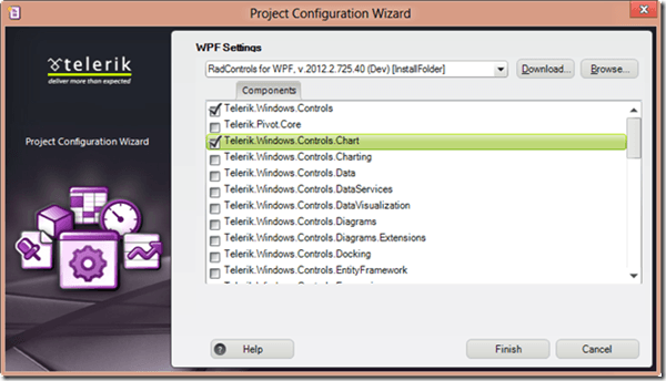 Place a check in Telerik.Windows.Controls.Chart and you will notice that the dependent references are added automatically for you. You can switch over to the MainWindow.xaml and see the Telerik XML Namespace has been added as well.