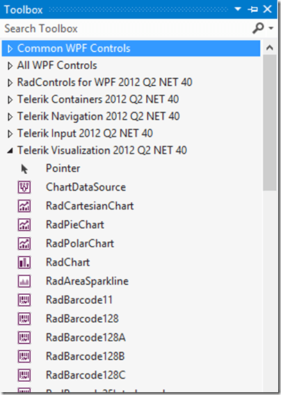 Open the VS2012 Toolbox and you will also see all of our other RadControls are available to drag and drop just like they were in VS2010.