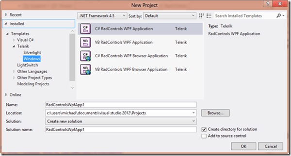 Once everything is installed, launch VS2012 RTM and navigate the project tree until you find the Telerik Project Templates. You will notice that the WPF project templates in VS2012 RC look very similar to what they did in VS2010 as shown in Figure 1.