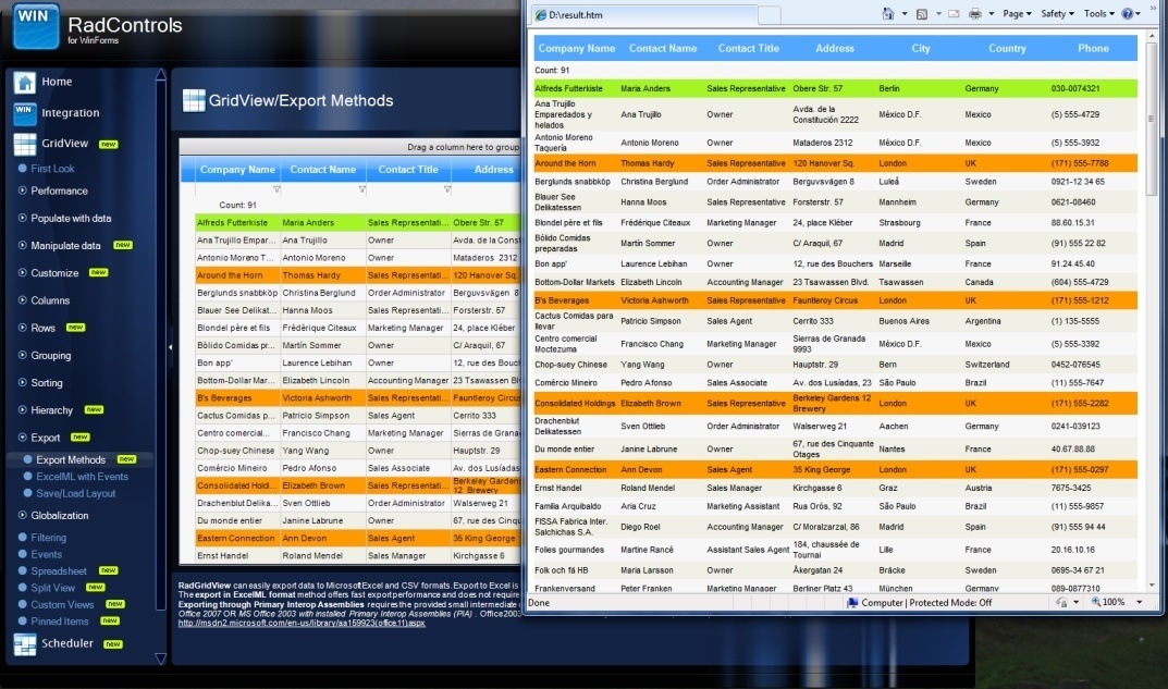 void ExportToCsvMethod(RadGridView radGridView, string filePath){ ExportToCSV csvExporter = new ExportToCSV(radGridView); csvExporter.FileExtension = "csv"; //this is the default value anyway csvExporter.HiddenColumnOption = HiddenOption.DoNotExport; csvExporter.HiddenRowOption = HiddenOption.ExportAlways; csvExporter.SummariesExportOption = SummariesOption.ExportAll; csvExporter.RunExport(filePath);}The ExportToHTML class has similar structure. It creates a html formatted file, which can be opened with MS Excel, MS World or any internet browser. It supports very close to ExportToExcelML options, events and features. Feel free to experiment with the various options in beta: